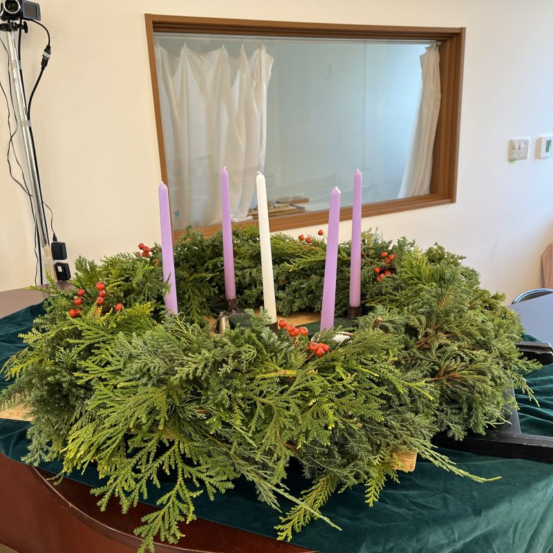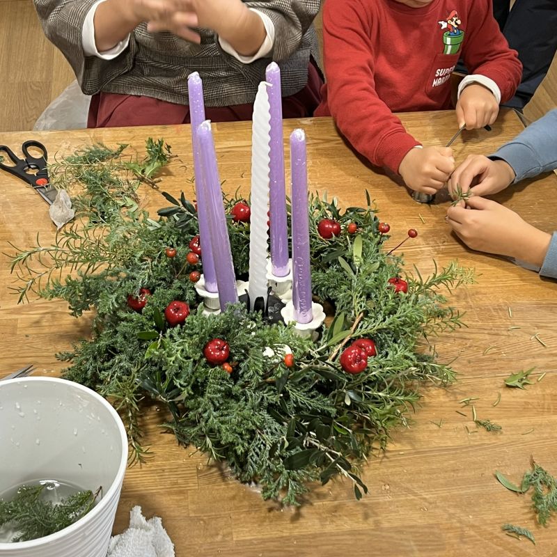 11月23日 礼拝堂用の大きなクランツは大人たちが準備 赤と緑がきれいです