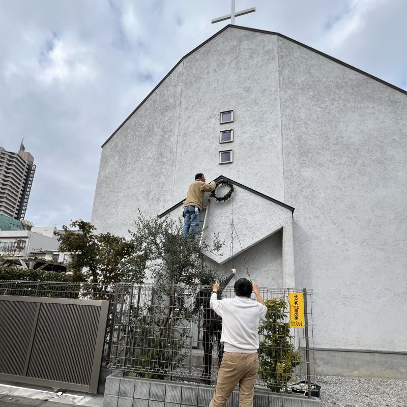 11月23日 教会正面に、リースと綺麗な明かりを取り付けます