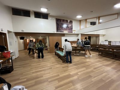 11月23日夜 青年達が、青年会が終わった後に、礼拝堂の椅子を集会室にすっかり運び出してくれました